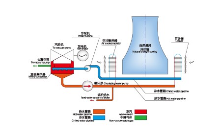 火电厂中,锅炉产生的高温高压水蒸气进入汽轮机做功推动发电机发电,做功后的乏汽从汽轮机尾部排入凝汽器进行第一次换热,乏汽将热量传递给冷却水冷凝为凝结水,由给水泵送回锅炉,进入下一个热功循环。